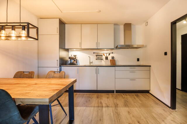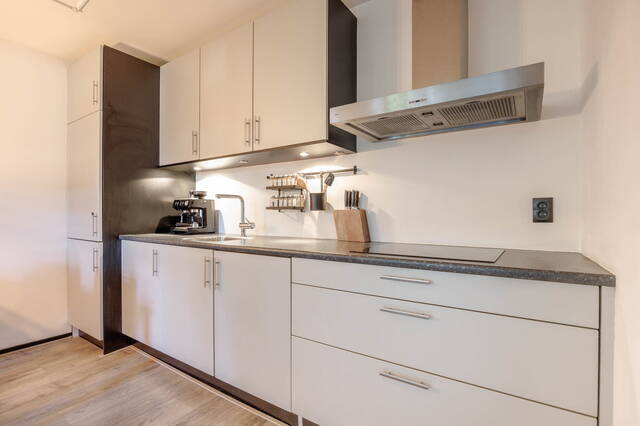 The inviting living room features a beautiful open kitchen equipped with an induction hob and extractor hood, a dishwasher, a boiler (80L), and recessed spotlights. The washing machine is neatly integrated into a kitchen cupboard.