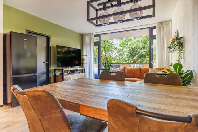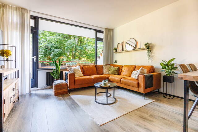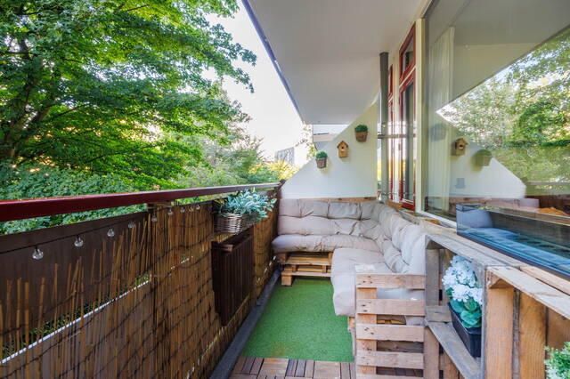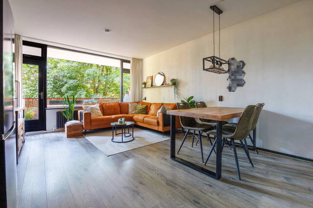 De ruime woonkamer geeft toegang tot het gezellige balkon met zicht op veel groen met mooie bomen waardoor je in de zomer veel privacy hebt.