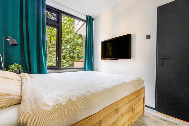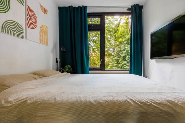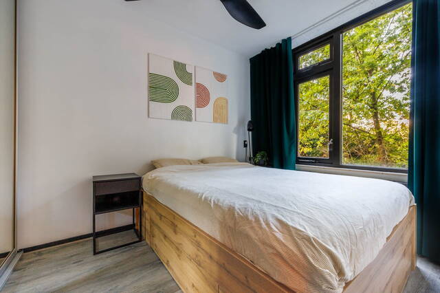 De slaapkamer is vanuit de woonkamer bereikbaar en is licht door de grote ramen. Er is voldoende ruimte om een grote garderobekast te plaatsen.