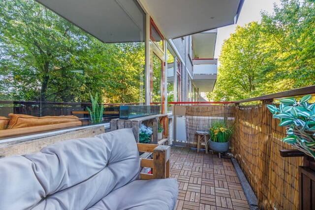 The spacious living area opens out to a cozy balcony with views of mature greenery and tall trees, offering great privacy during the summer months.