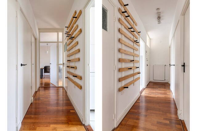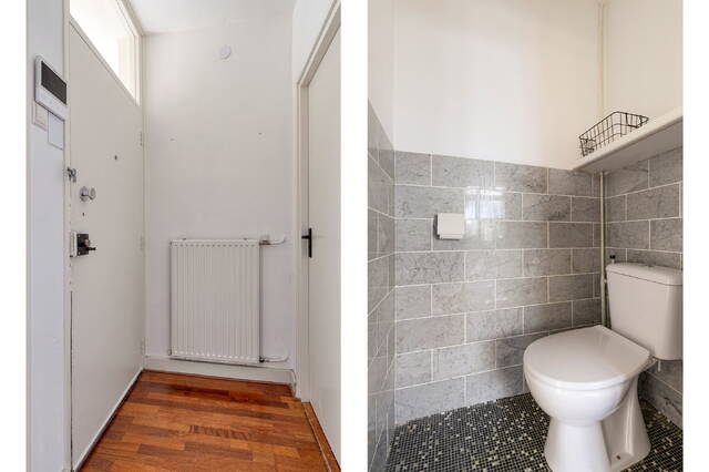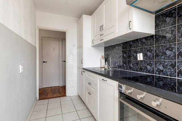 Via de centrale entree met intercom, brievenbussen en toegang tot de bergingen bereik je het appartement. De hal geeft toegang tot twee slaapkamers aan de voorzijde, een apart toilet, handige bergkasten, de keuken en de lichte woonkamer.