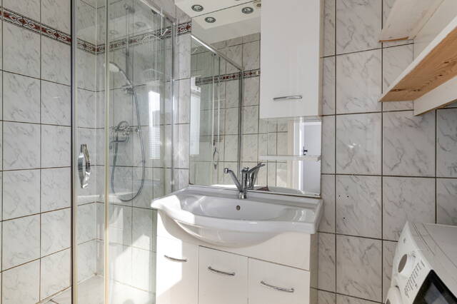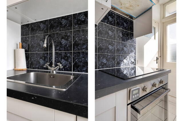 De keuken is praktisch ingedeeld in een rechte opstelling en uitgerust met diverse inbouwapparatuur, waaronder een inductiekookplaat, afzuigkap, oven en koel-vriescombinatie. Vanuit de keuken is er toegang tot de badkamer met douche, wastafel en aansluiting voor de wasmachine.