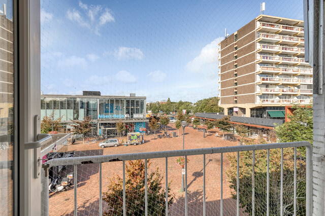 De ruime woonkamer vormt het hart van de woning en biedt toegang tot de derde slaapkamer. Deze kamer grenst direct aan het balkon aan de achterzijde. Het tweede balkon is bereikbaar via een van de slaapkamers aan de voorzijde en kijkt uit over het levendige winkelplein.