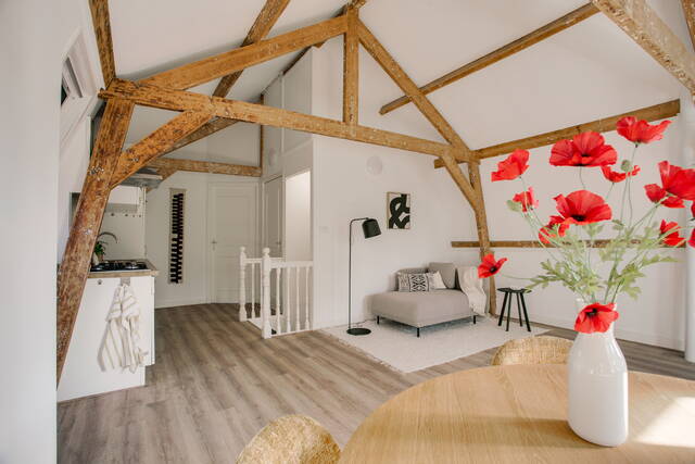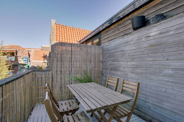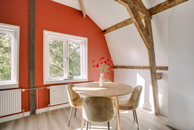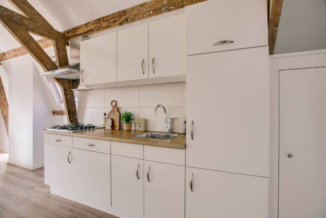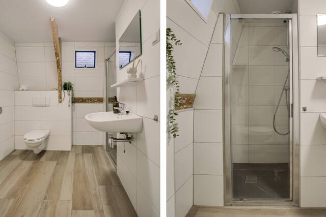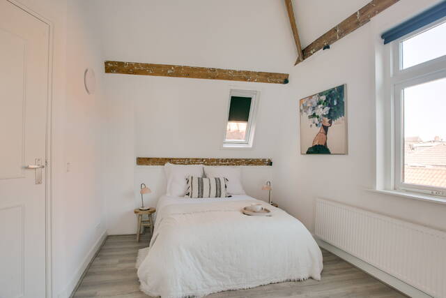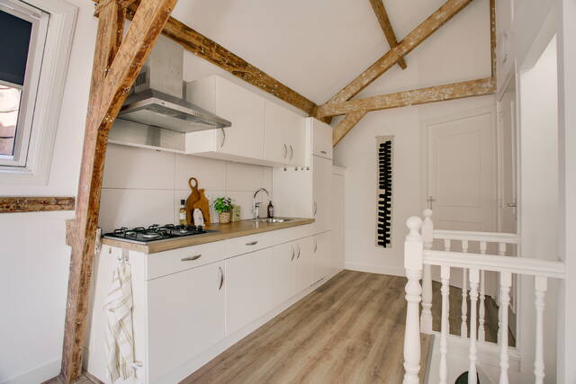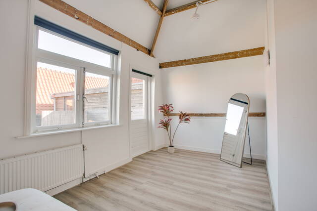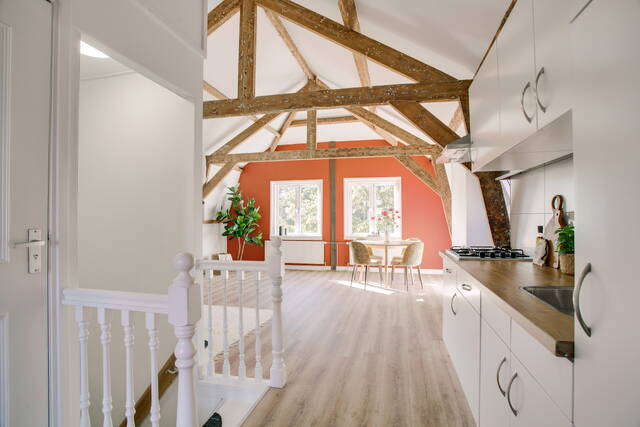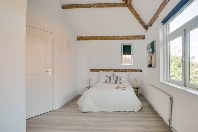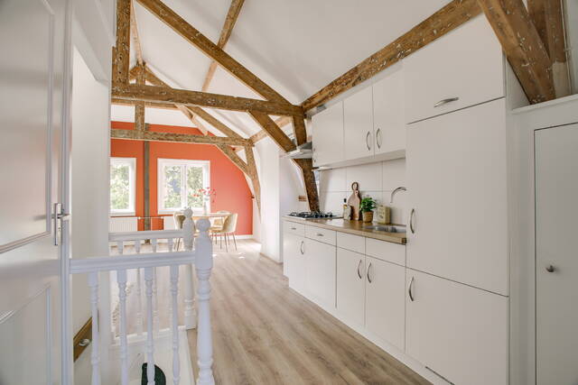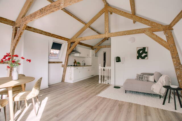 De woonkamer straalt sfeer uit dankzij de karakteristieke houten balken en de fraaie lichtinval door de grote ramen. Aan de achterzijde bevindt zich de slaapkamer, die direct toegang biedt tot de moderne en ruime badkamer. Deze is uitgerust met een douche, wastafel en toilet, een aansluiting voor de wasmachine en droger en uitgevoerd in een frisse, tijdloze stijl.