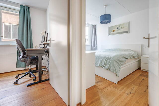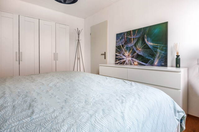 Through the hallway, you reach two comfortable and well-sized bedrooms. The bathroom includes a bathtub/shower combination, washbasin with mirror, mechanical ventilation, design radiator, and connections for a washing machine and dryer. In the hallway, you’ll also find a modern separate toilet with a small sink, the meter cupboard, and the central heating system (neatly enclosed in a cabinet).