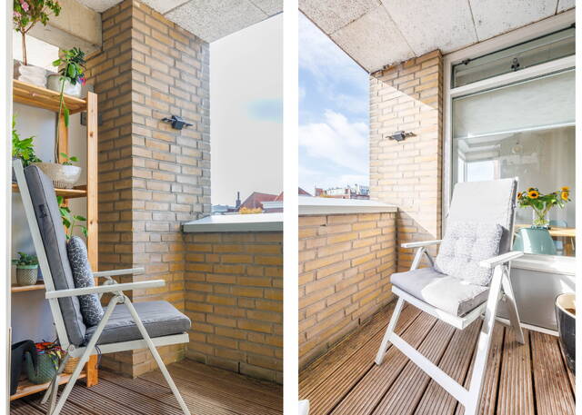 The charming south-facing balcony offers plenty of privacy — a perfect spot to relax in the sun and enjoy the view.
