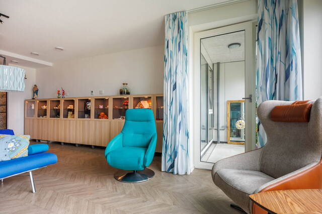 Spacious hallway with a cosy sitting nook and access to all rooms. The bright living room features an open, large luxury kitchen with a (peninsula) cooking island and seating area, fitted with various built-in appliances including an induction hob with integrated extractor, oven, microwave, dishwasher, and large refrigerator. The attractive kitchen consists of three sections: a cooking island, a sink area, and a cosy coffee corner — offering more than enough workspace and storage.