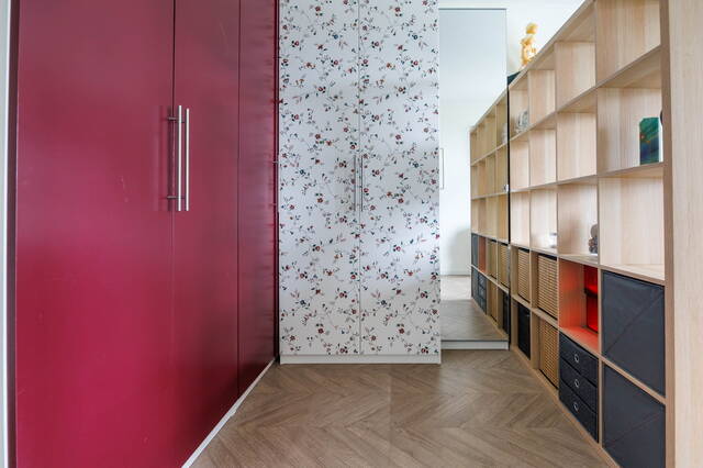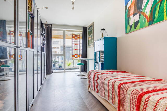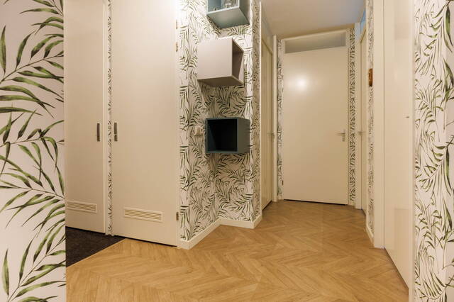 The spacious three-room apartment (formerly four-room) is located on the sixth floor with beautiful views and features a luxurious kitchen, a modern bathroom, a loggia, two toilets, an internal storage room, and a stunning laminate floor with underfloor heating and cooling. In addition, the apartment includes an external storage space directly opposite the front door, an extra (rented) storage unit on the ground floor, and a private spot in the bicycle storage for two bikes. The entire complex is completely gas-free, equipped with an energy-efficient heat pump system (WTW), and built with sustainability in mind.