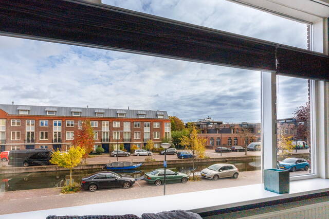 Bright and sunny living room with large windows, built-in storage, and a beautiful view over the canal (Singel).