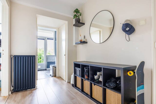 Entrance, spacious hallway with meter cupboard, storage closet, separate toilet, and access to all rooms in the apartment.