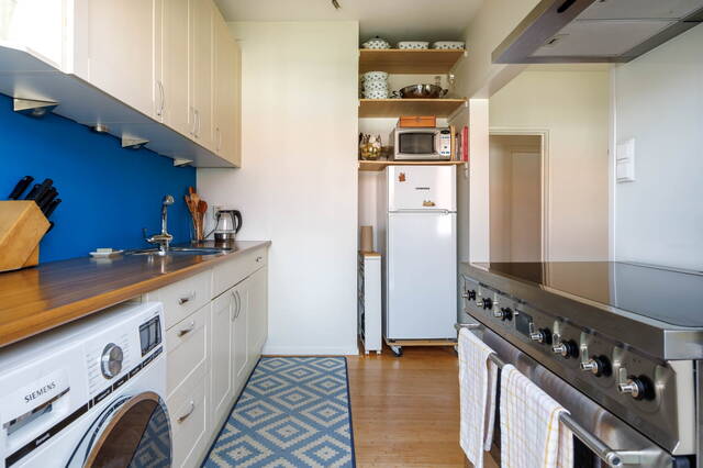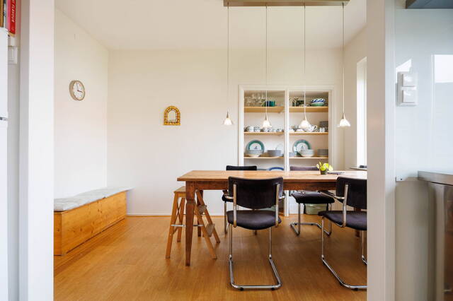 The spacious kitchen is located at the rear and includes a large dining area. The bright kitchen is equipped with an induction stove, extractor hood, dishwasher, and plenty of cupboard space. From both the dining area and kitchen, you have a lovely view of the beautiful courtyard garden and access to the rear balcony, where the washing machine connection is also located.