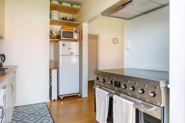De royale woonkeuken bevindt zich aan de achterzijde en heeft een groot eetgedeelte. De lichte keuken beschikt o.a. over een inductiefornuis, een afzuigkap, een vaatwasser en veel kastruimte. Vanuit het eetgedeelte en de keuken heb je heerlijk uitzicht op de mooie binnentuin en toegang tot het balkon. Hier bevindt zich tevens de aansluiting voor de wasmachine.