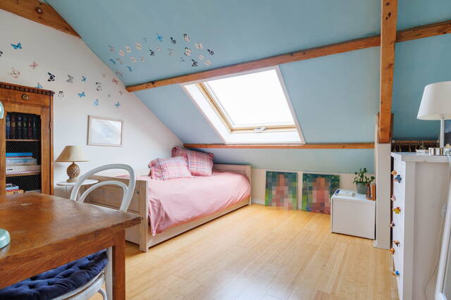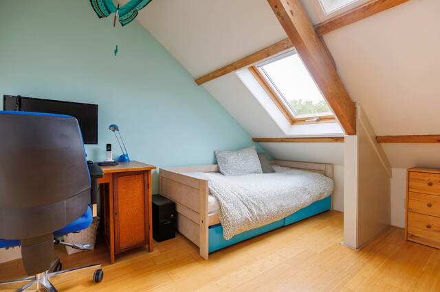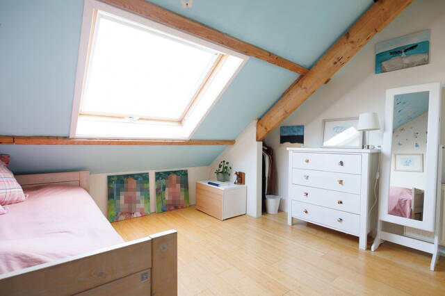 The spacious landing with an open ceiling and visible original beams provides access to four bright bedrooms, a bathroom, and additional storage space. All bedrooms are well-sized, feature either a dormer or Velux window, and have smooth plastered walls with exposed beams for added character.