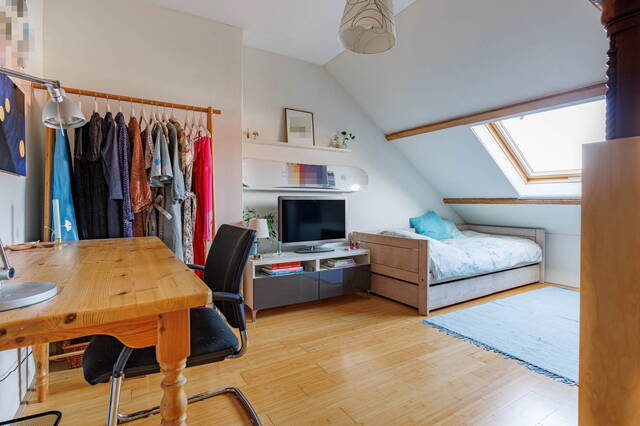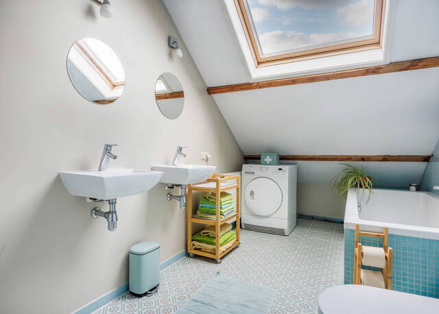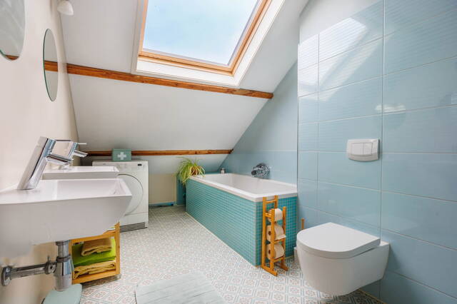 The modern second bathroom is very spacious and includes two washbasins, a bathtub, a walk-in shower, a toilet, and a connection for a dryer. Both this bathroom and the first one (plus the separate toilet) are finished in tasteful colors with elegant floor tiles. From the landing, there is access to a large attic for even more storage space.