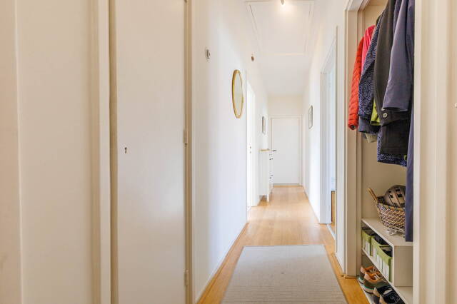 Entree appartement. Ruime hal met toegang tot de woon-/eetkamer, de woonkeuken, een slaapkamer, een badkamer en een separaat toilet. De ruime en zonnige woonkamer bestaat uit twee delen, een royaal zitgedeelte met een sierschouw en een eetgedeelte met toegang tot een gezellig balkon aan de voorzijde.