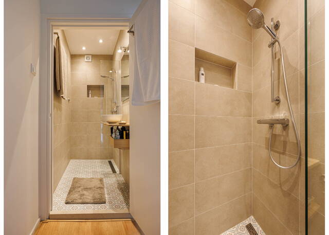 The hallway also leads to the first modern bathroom with a walk-in shower (featuring a niche and glass partition), recessed lighting, mechanical ventilation, and a washbasin cabinet. The separate toilet, finished in the same attractive style, is also accessible from the hall.