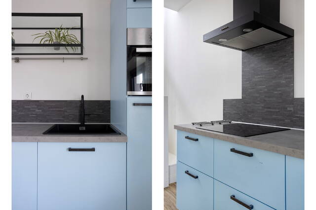 Charming kitchen with an induction hob, extractor hood, combi-oven, dishwasher, and fridge/freezer combination.