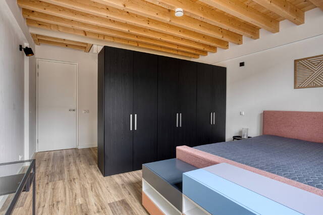 Via the fixed staircase from the first floor, you reach the spacious bedroom and modern bathroom. The bathroom is equipped with a walk-in shower, toilet, and vanity unit. The washing machine and dryer are also conveniently integrated.