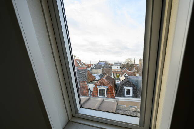 • Naastgelegen is de compacte slaapkamer, voorzien van drie ramen met uitzicht op de skyline van Leiden (o.a. Pieterskerk).