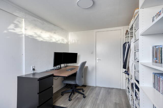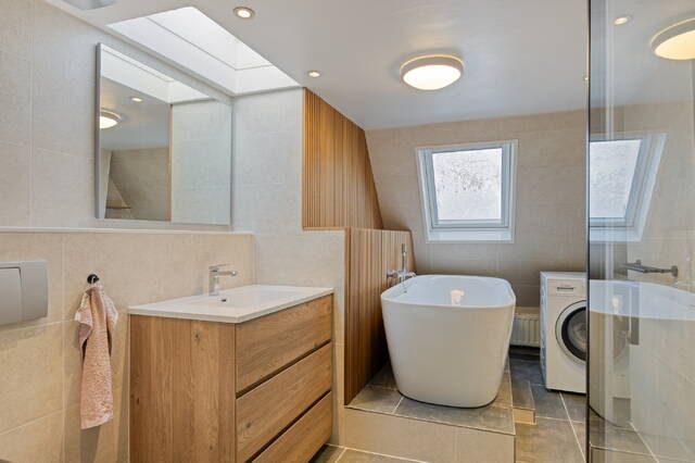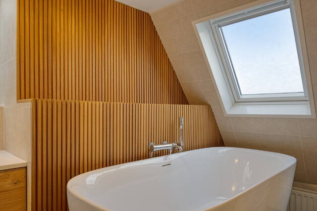 Overloop met toegang tot de tweede en derde slaapkamer. De eerste slaapkamer, gelegen aan de achterzijde is perfect te gebruiken als kinderkamer, werkkamer of als grote inloopkast. De ruime hoofdslaapkamer aan de voorzijde beschikt over een grote inbouwkast en biedt toegang tot de moderne en stijlvolle en suite badkamer. Deze is voorzien van een ligbad, douche, wastafelmeubel, toilet en wasmachineaansluiting. Mede door het dakraam een comfortabele en rustgevende plek om de dag te beginnen of af te sluiten.