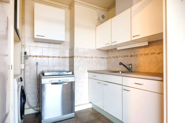 Adjacent is the open kitchen, featuring a tiled floor and ample cupboard space. The washing machine connection is also located here.