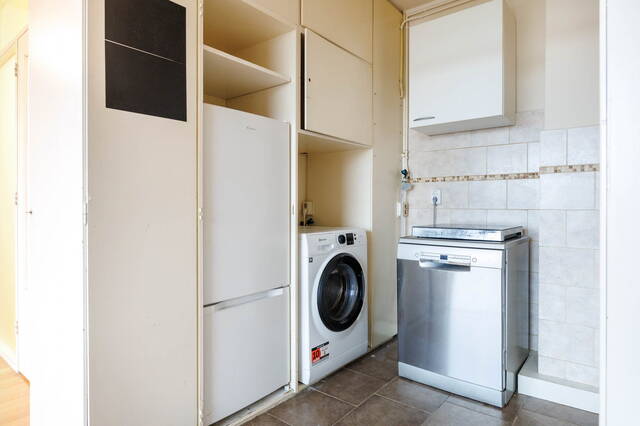 Aansluitend een open keuken, voorzien van een tegelvloer en veel kastruimte. Hier bevindt zich tevens de aansluiting voor de wasmachine.