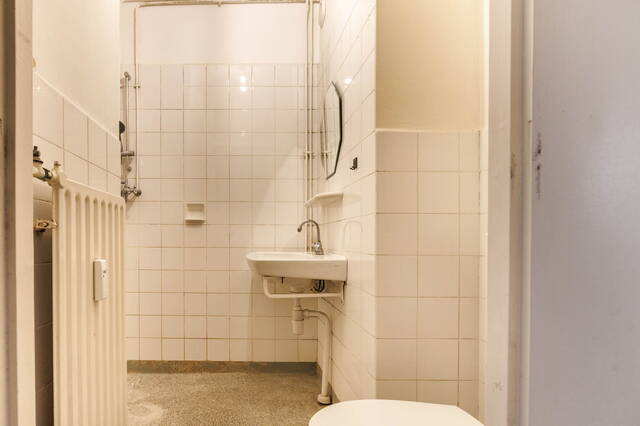 Entree. Hal met toegang tot de badkamer en de woonkamer. De badkamer heeft een originele granitovloer en is voorzien van een douche, toilet en wastafel.