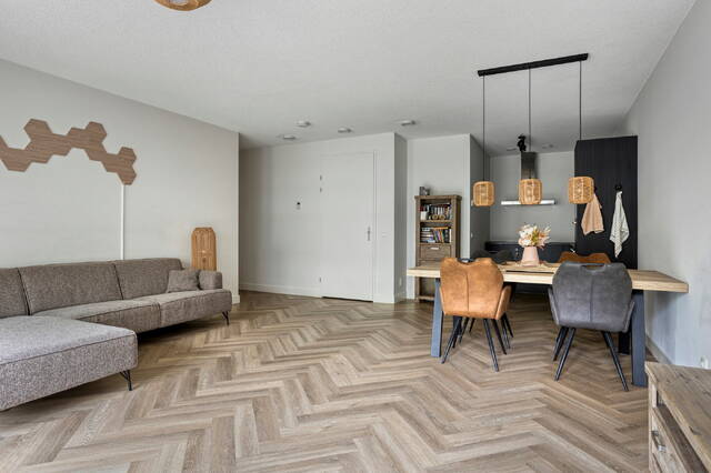 Het appartement is gelegen op de derde verdieping en biedt een royale woonoppervlakte met een prettige, lichte indeling. De woonkamer vormt samen met de open keuken het hart van de woning. De keuken is modern en luxe uitgevoerd en voorzien van complete inbouwapparatuur, waaronder een inductiekookplaat, oven, magnetron, vaatwasser en een ruime koel-vriescombinatie. De stijlvolle pvc-visgraatvloer in combinatie met vloerverwarming en -koeling zorgt voor optimaal wooncomfort in elk seizoen.