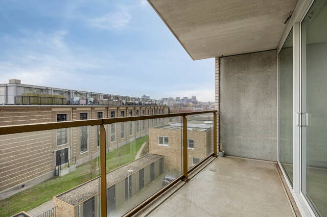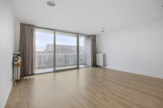 De ruime woonkamer is licht en prettig ingedeeld. Grote ramen zorgen voor een open en ruimtelijk gevoel en bieden een vrij uitzicht richting de stad. Vanuit de woonkamer is er directe toegang tot het balkon, dat over de volledige breedte van het appartement loopt en gunstig op het zuiden is gelegen — een fijne plek om van de zon en het uitzicht te genieten.