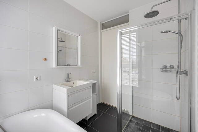 De badkamer is modern uitgevoerd en voorzien van een inloopdouche, ligbad en wastafelmeubel. Het toilet is separaat en bereikbaar vanuit de hal. Daarnaast zijn er twee praktische berg-/technische ruimtes aanwezig, waaronder een aparte wasruimte en een ruimte voor de WTW-installatie.