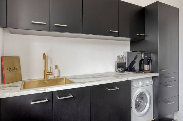 De moderne keuken is uitgerust met een lichte, rechte keukenopstelling, voorzien van een 4-pits inductiekookplaat, een vaatwasser, een grote koel-vriescombinatie en diverse kasten voor extra opbergruimte. Hier bevindt zich ook de aansluiting voor de wasmachine. Vanuit de keuken heeft u toegang tot het balkon aan de voorzijde.