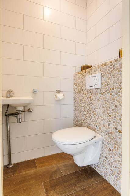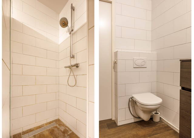 De tweede badkamer beschikt over een tweede toilet, een wastafelmeubel met kasten, een inloopdouche en een handdoekenradiator. Beide badkamers zijn modern en volledig betegeld.