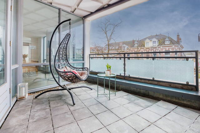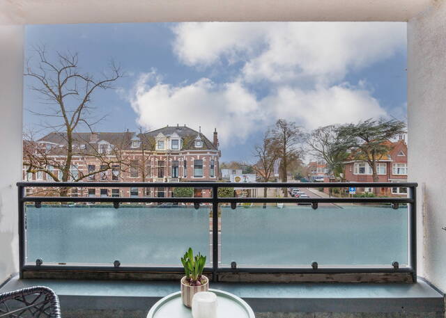 Vanuit de woonkamer is het royale, overdekte balkon op het zuiden bereikbaar, met voldoende ruimte voor een comfortabele zithoek en een fraai uitzicht over de buitenring van Leiden.