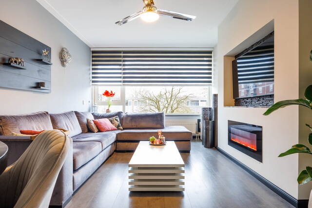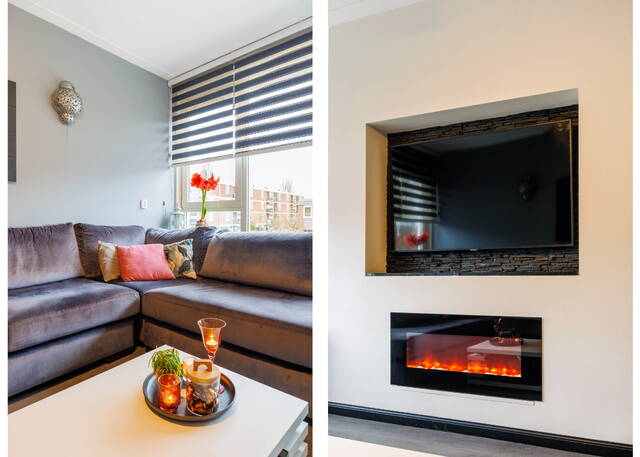 Entree van het appartement. Ruime hal met meterkast en een toilet. Royale en lichte woonkamer met een op maat gemaakt tv-meubel en een elektrische sierhaard die veel sfeer creëert. Vanuit de woonkamer is er toegang tot de eerste slaapkamer aan de achterzijde van het appartement, voorzien van een ingebouwd hoofdbord met eveneens een sfeervolle sierhaard.