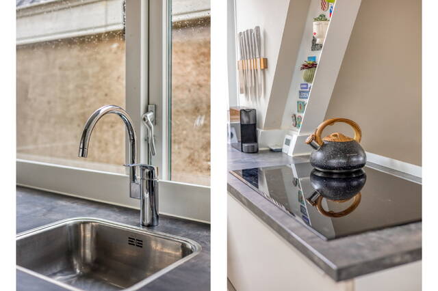 The bright living area features two large dormer windows and offers attractive views over the water and the Beestenmarkt at the front. The open-plan layout creates a light, modern and inviting atmosphere.
