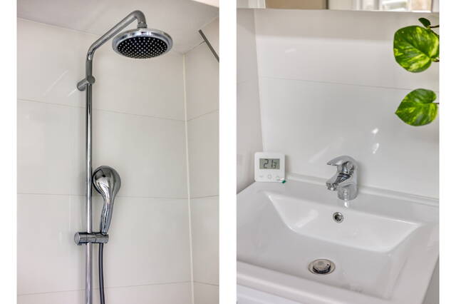 The stylishly finished bathroom is located under a dormer window and includes a rain shower, wall-hung toilet, washbasin and designer radiator.