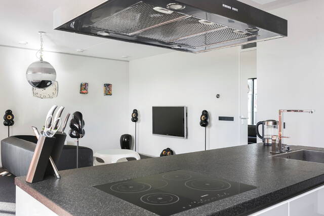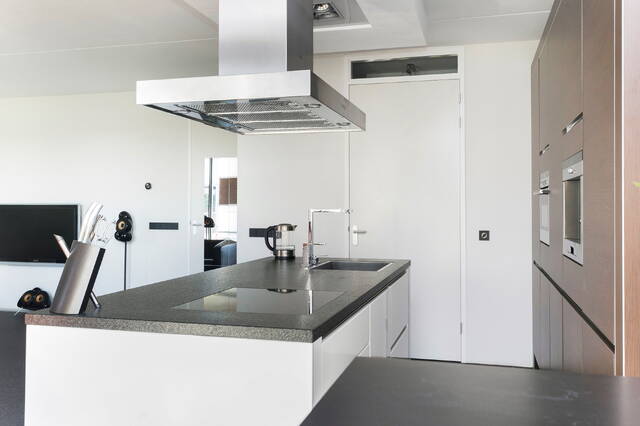 1st floor: Entrance apartment with spacious corridor. Spacious and bright living room with luxurious open kitchen with island and severall built in appliances. The roof terrace is accessible through folding doors and is facing South, thanks to the open location it is sunny almost all day. Utilityroom with washing machine connection. Spacious bedroom. Bathroom with jacuzzi, shower, washbasin and toilet.
