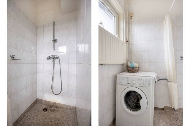 The bathroom is practically designed and equipped with a walk-in shower and a washing machine connection.