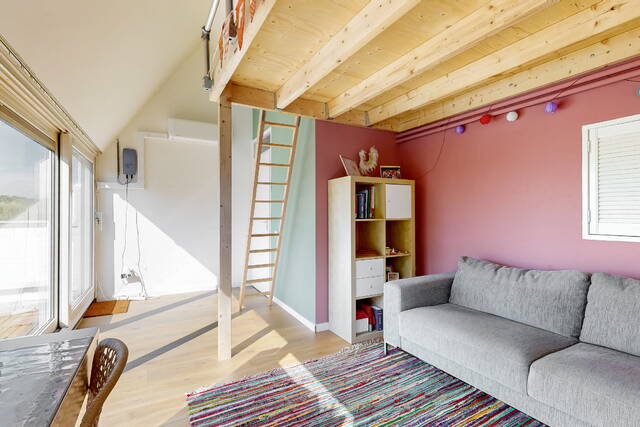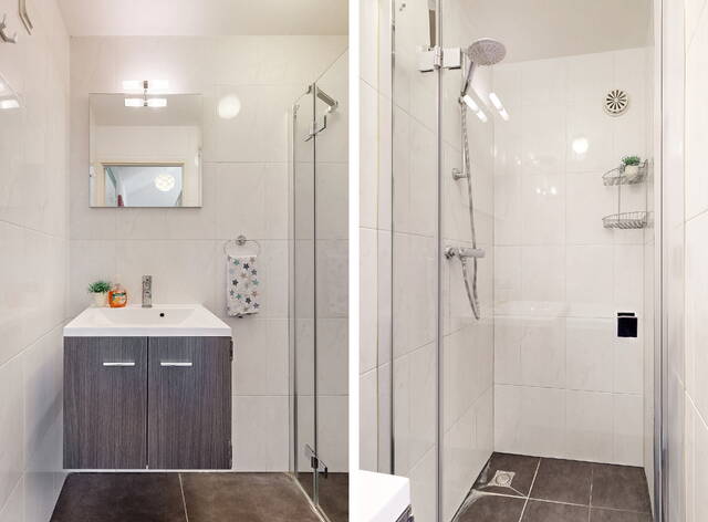 The mezzanine is accessible via a number of steps. The landing provides access to a third bedroom, the second bathroom and a separate toilet. The modern bathroom has a walk-in shower and a sink with furniture.