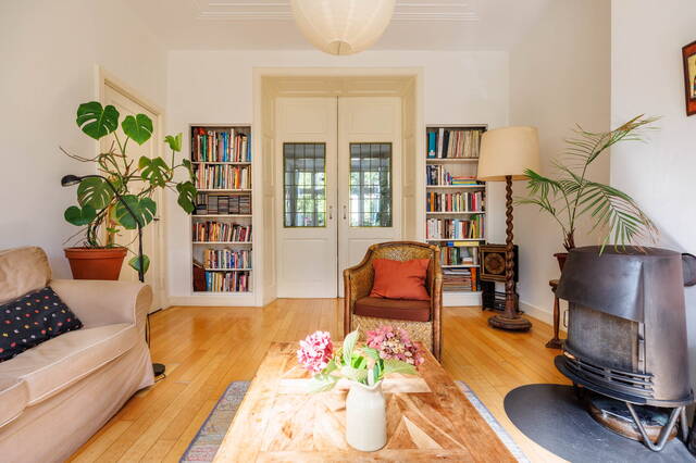Entrance with vestibule and original details like stained glass and granite flooring. Bright living room with bay window, wood stove, and en-suite doors to the dining area. French doors open to the back garden. The kitchen features built-in appliances, a classic buffet cabinet, and granite flooring.