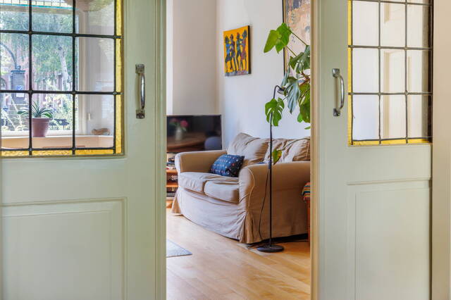 Original features include stained glass windows, granite floors, high ceilings, panel doors, and en-suite sliding doors. Thanks to its corner location, the home has extra side windows for beautiful natural light. Balconies on both sides, and blue-and-white awnings on the front bedrooms, help keep the house pleasantly cool in summer.