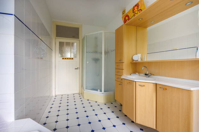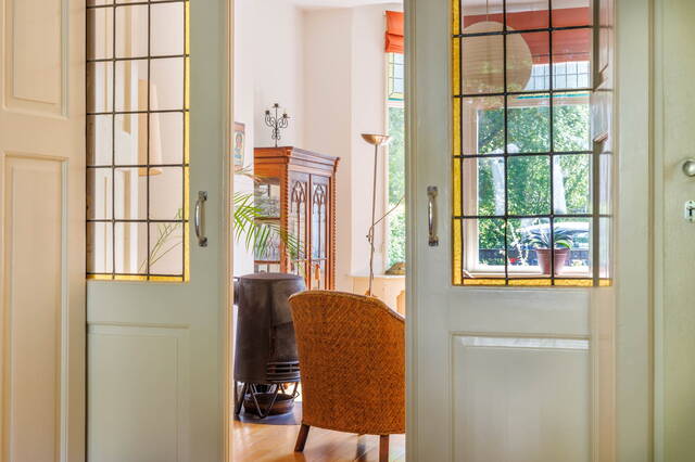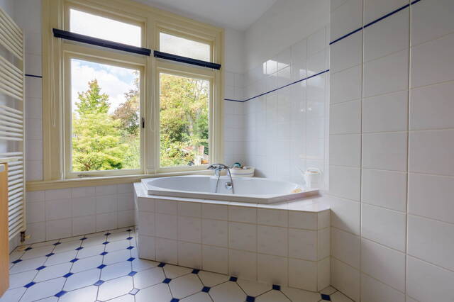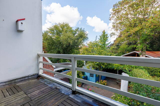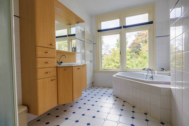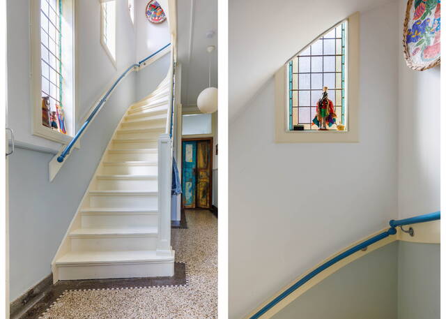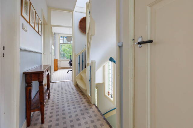De statige trap naar de 1ste verdieping heeft door de hoekligging van de woning prachtige glas-in-lood ramen die voor heel mooi licht zorgen. Er is een royale overloop met trapopgang naar de 2e etage en toegang tot de drie (slaap)kamers, de badkamer en een separaat toilet. Zowel de zeer ruime en lichte slaapkamer aan de voor- als aan de achterzijde beschikt over een balkon met uitzicht op veel groen.