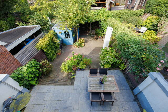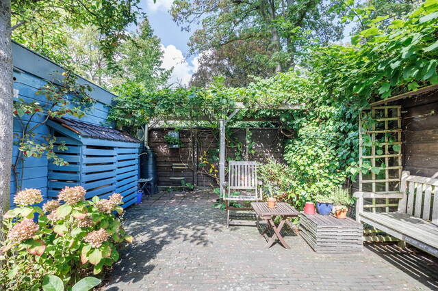 Zowel middels de openslaande deuren vanuit de eetkamer als vanuit de keuken bereikt u de groene en zonnige achtertuin met een fraai terras en een lager gelegen gedeelte met meerdere mogelijkheden voor zitjes in een pergola en een prieeltje. Er is fraaie beplanting met veel groen, waaronder een sierappelboom en achterin een pergola begroeid met druivenranken en blauwe regen, waar u tijdens warme dagen heerlijk beschut kunt zitten. In de tuin bevinden zich tevens twee regentonnen. Naast de achtertuin heeft de woning ook een zonnige voortuin en een zijpad met toegang naar de achtertuin. Het grindpad zorgt voor veiligheid aan de zij- en achterkant van het huis.