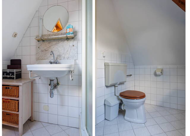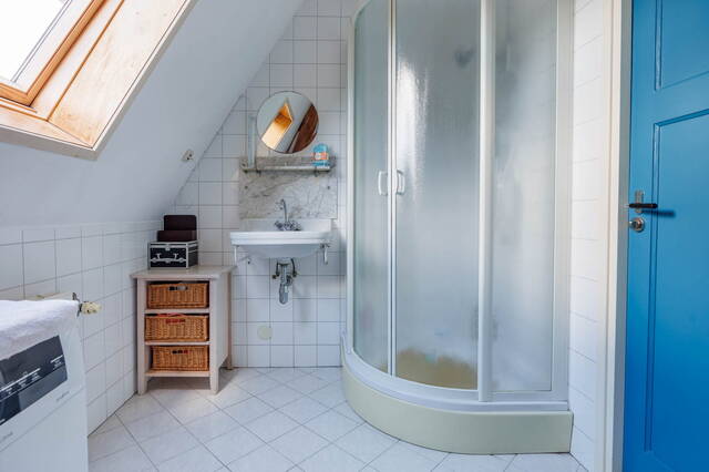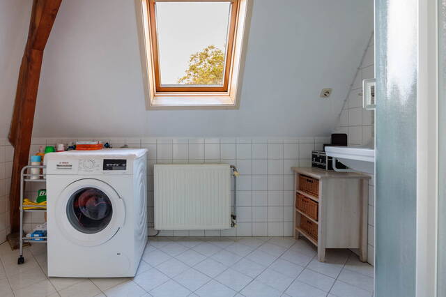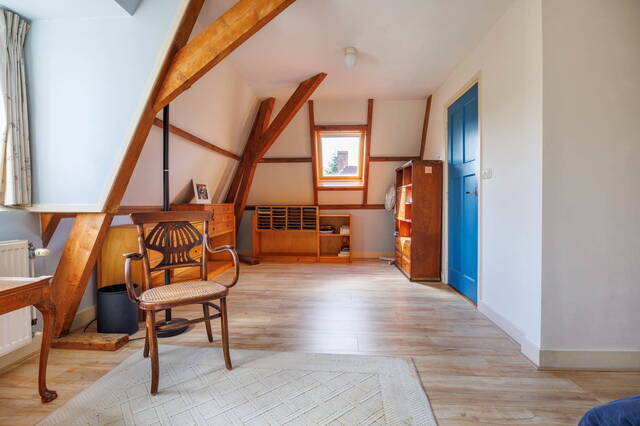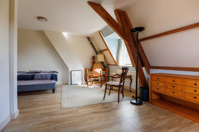 Via de vaste trap bereikt u een zeer royale overloop met toegang tot de twee (slaap)kamers. In de ruime L-vormige kamer aan de voorzijde (voorheen 2 slaapkamers en gemakkelijk weer op te delen) zijn de mooie originele balken en spanten zichtbaar. Daarnaast is er een dakkapel aan de voorzijde en een velux zijraam waardoor deze ruimte licht is. De slaapkamer aan de achterzijde met dakkapel is ook goed van formaat en heeft ook mooi uitzicht over de groene omgeving. De tweede badkamer beschikt over een toilet, een douche en een wastafel. Hier bevindt zich tevens de opstelling voor de wasmachine.