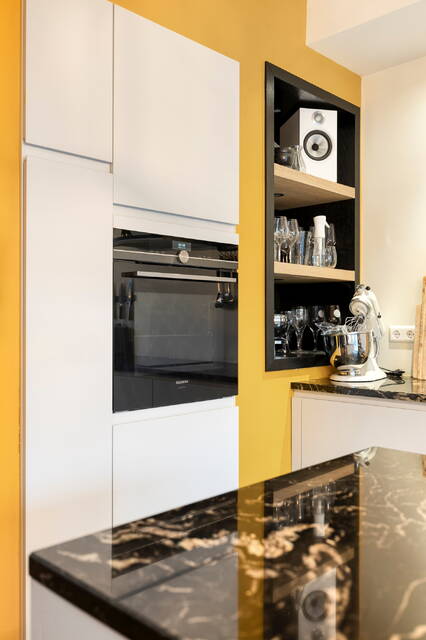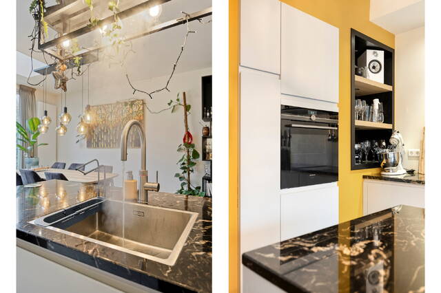 De moderne uitgebouwde open keuken met kookeiland is een droom voor elke thuiskok: veel kast- en bergruimte, een moderne grote inductiekookplaat, vaatwasser, Amerikaanse koelkast, ruime wijnkoelkast, stoomoven, Quooker én directe toegang tot de tuin met vrijstaande houten berging en achterom.