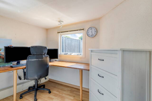The front garden is generous and includes a shed for bikes. The approximately 21-meter deep backyard faces south and has a spacious shed measuring about 5 by 5 meters.