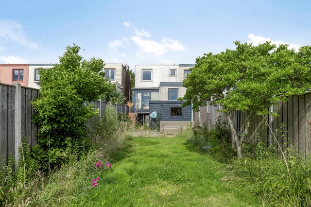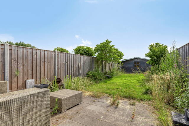 De voortuin is royaal en heeft een schuur voor de fietsen. De circa 21 meter diepe achtertuin ligt op het zuiden en beschikt over een ruime schuur van circa 5 bij 5 meter.