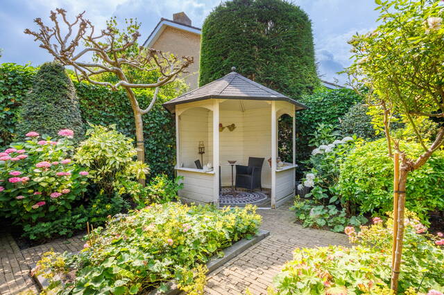 Via the beautifully landscaped front garden, you enter the hallway, which includes a coat area and a toilet with a small sink. From the hallway, you step into the spacious and bright L-shaped living room with a cozy open fireplace and an open-plan kitchen. The room has large windows, letting in plenty of natural light, and a charming side area that also overlooks the garden. Through the sliding doors, you access the generously sized and beautifully landscaped south-facing backyard, where you can enjoy the sun all day long. There is a cozy gazebo, a sunshade, and built-in storage cabinets for extra space.