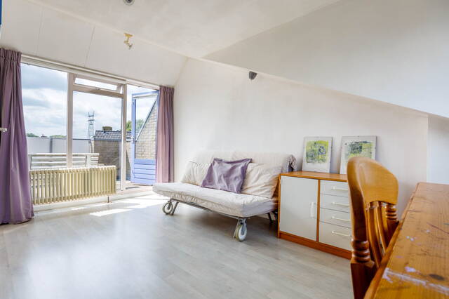 Royale overloop met wastafel en een extra berging aan de achterzijde met een Velux dakraam en opstelling CV-ketel en zonnecollector. De gezellige en lichte slaapkamer heeft een vaste kast aan de voorzijde en grenst aan de achterzijde aan het balkon met prachtig uitzicht op de Zijl.