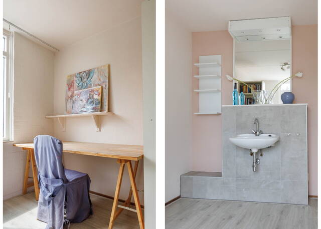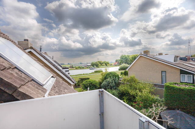 Large landing with a washbasin and additional storage at the rear, featuring a Velux skylight and housing the central heating system and solar water heater. The cozy and bright bedroom has a built-in wardrobe at the front and opens onto a rear balcony with a stunning view over the river Zijl.